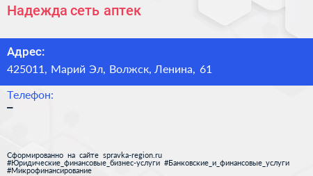 Надежда, сеть аптек по адресу 425011, Марий Эл, Волжск, Ленина, 61 в дальнейшем Организация, размещена в следующих категориях: