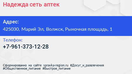 Надежда, сеть аптек по адресу 425030, Марий Эл, Волжск, Рыночная площадь, 1 в дальнейшем Организация, размещена в следующих категориях: