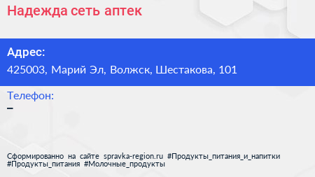 Надежда, сеть аптек по адресу 425003, Марий Эл, Волжск, Шестакова, 101 в дальнейшем Организация, размещена в следующих категориях: