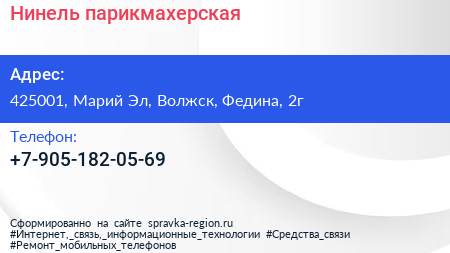 Нинель, парикмахерская по адресу 425001, Марий Эл, Волжск, Федина, 2г в дальнейшем Организация, размещена в следующих категориях: