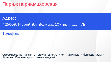 Париж, парикмахерская по адресу 425009, Марий Эл, Волжск, 107 Бригады, 7Б в дальнейшем Организация, размещена в следующих категориях: