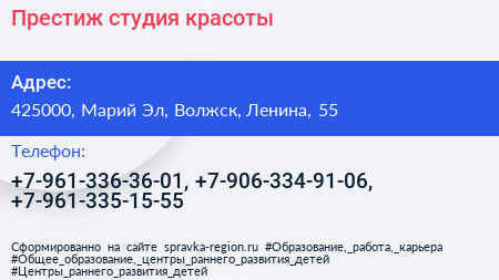 Престиж, студия красоты по адресу 425000, Марий Эл, Волжск, Ленина, 55 в дальнейшем Организация, размещена в следующих категориях: