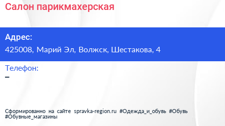 Салон-парикмахерская по адресу 425008, Марий Эл, Волжск, Шестакова, 4 в дальнейшем Организация, размещена в следующих категориях: