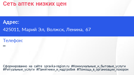 Сеть аптек низких цен по адресу 425011, Марий Эл, Волжск, Ленина, 67 в дальнейшем Организация, размещена в следующих категориях: