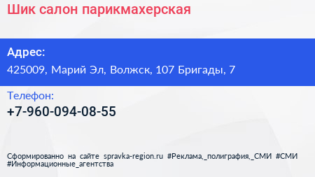 Шик, салон-парикмахерская по адресу 425009, Марий Эл, Волжск, 107 Бригады, 7 в дальнейшем Организация, размещена в следующих категориях: