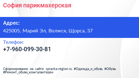 София, парикмахерская по адресу 425005, Марий Эл, Волжск, Щорса, 37 в дальнейшем Организация, размещена в следующих категориях:
