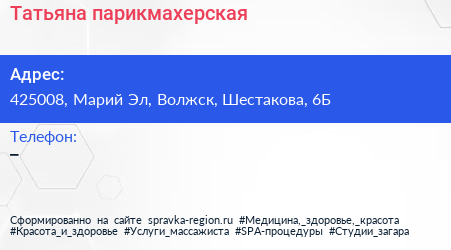 Татьяна, парикмахерская по адресу 425008, Марий Эл, Волжск, Шестакова, 6Б в дальнейшем Организация, размещена в следующих категориях: