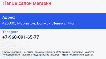 TianDe, салон-магазин по адресу 425000, Марий Эл, Волжск, Ленина, 44а в дальнейшем Организация, размещена в следующих категориях: