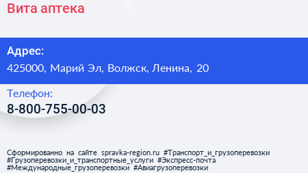 Вита, аптека по адресу 425000, Марий Эл, Волжск, Ленина, 20 в дальнейшем Организация, размещена в следующих категориях: