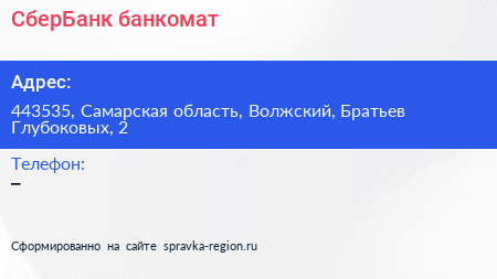 СберБанк, банкомат по адресу 443535, Самарская область, Волжский, Братьев Глубоковых, 2 в дальнейшем Организация, размещена в следующих категориях: