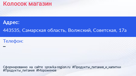 Колосок, магазин по адресу 443535, Самарская область, Волжский, Советская, 17а в дальнейшем Организация, размещена в следующих категориях: