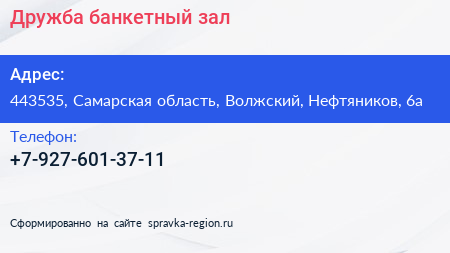 Дружба, банкетный зал по адресу 443535, Самарская область, Волжский, Нефтяников, 6а в дальнейшем Организация, размещена в следующих категориях: