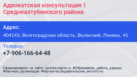 Адвокатская консультация №1 Среднеахтубинского района по адресу 404143, Волгоградская область, Волжский, Ленина, 41 в дальнейшем Организация, размещена в следующих категориях: