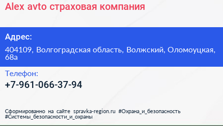 Alex avto, страховая компания по адресу 404109, Волгоградская область, Волжский, Оломоуцкая, 68а в дальнейшем Организация, размещена в следующих категориях: