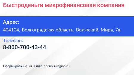 Быстроденьги, микрофинансовая компания по адресу 404104, Волгоградская область, Волжский, Мира, 7а в дальнейшем Организация, размещена в следующих категориях: