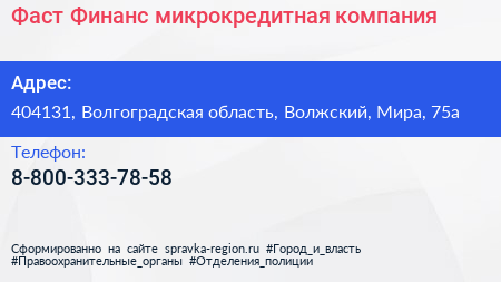 Фаст Финанс, микрокредитная компания по адресу 404131, Волгоградская область, Волжский, Мира, 75а в дальнейшем Организация, размещена в следующих категориях:
