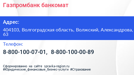 Газпромбанк, банкомат по адресу 404103, Волгоградская область, Волжский, Александрова, 63 в дальнейшем Организация, размещена в следующих категориях: