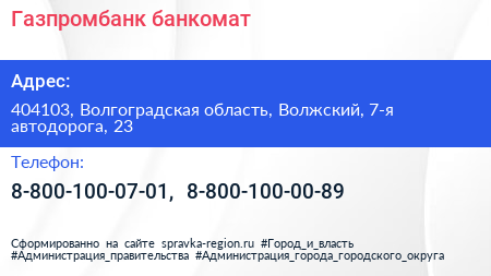 Газпромбанк, банкомат по адресу 404103, Волгоградская область, Волжский, 7-я автодорога, 23 в дальнейшем Организация, размещена в следующих категориях: