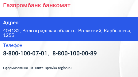 Газпромбанк, банкомат по адресу 404132, Волгоградская область, Волжский, Карбышева, 125Б в дальнейшем Организация, размещена в следующих категориях: