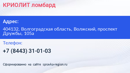 КРИОЛИТ, ломбард по адресу 404132, Волгоградская область, Волжский, проспект Дружбы, 105а в дальнейшем Организация, размещена в следующих категориях: