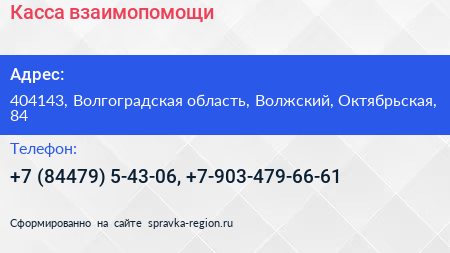 Касса взаимопомощи по адресу 404143, Волгоградская область, Волжский, Октябрьская, 84 в дальнейшем Организация, размещена в следующих категориях: