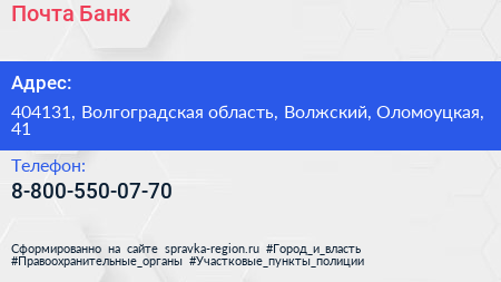 Почта Банк по адресу 404131, Волгоградская область, Волжский, Оломоуцкая, 41 в дальнейшем Организация, размещена в следующих категориях: