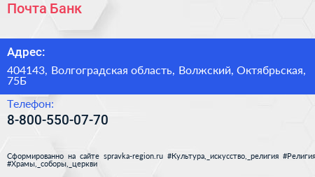 Почта Банк по адресу 404143, Волгоградская область, Волжский, Октябрьская, 75Б в дальнейшем Организация, размещена в следующих категориях: