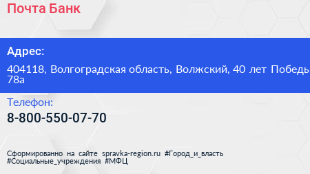 Почта Банк по адресу 404118, Волгоградская область, Волжский, 40 лет Победы, 78а в дальнейшем Организация, размещена в следующих категориях: