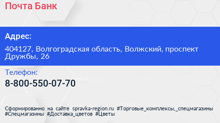 Почта Банк по адресу 404127, Волгоградская область, Волжский, проспект Дружбы, 26 в дальнейшем Организация, размещена в следующих категориях: