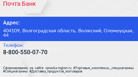 Почта Банк по адресу 404109, Волгоградская область, Волжский, Оломоуцкая, 44 в дальнейшем Организация, размещена в следующих категориях: