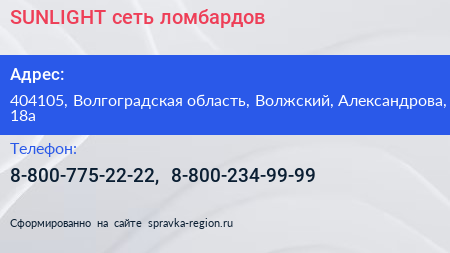 SUNLIGHT, сеть ломбардов по адресу 404105, Волгоградская область, Волжский, Александрова, 18а в дальнейшем Организация, размещена в следующих категориях: