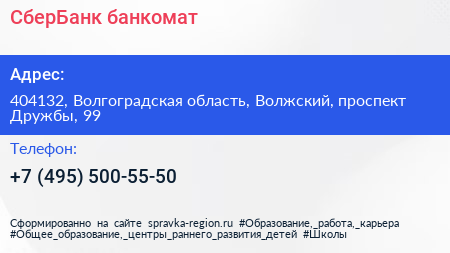 СберБанк, банкомат по адресу 404132, Волгоградская область, Волжский, проспект Дружбы, 99 в дальнейшем Организация, размещена в следующих категориях: