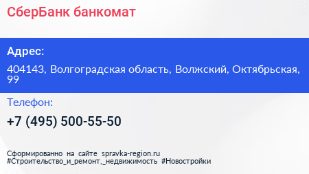 СберБанк, банкомат по адресу 404143, Волгоградская область, Волжский, Октябрьская, 99 в дальнейшем Организация, размещена в следующих категориях: