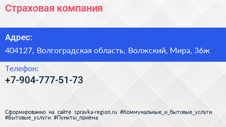 Страховая компания по адресу 404127, Волгоградская область, Волжский, Мира, 36ж в дальнейшем Организация, размещена в следующих категориях: