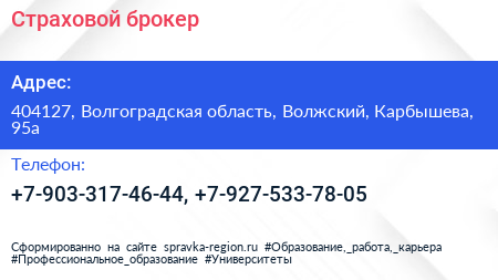 Страховой брокер по адресу 404127, Волгоградская область, Волжский, Карбышева, 95а в дальнейшем Организация, размещена в следующих категориях: