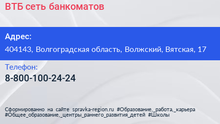 ВТБ, сеть банкоматов по адресу 404143, Волгоградская область, Волжский, Вятская, 17 в дальнейшем Организация, размещена в следующих категориях: