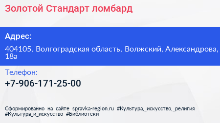 Золотой Стандарт, ломбард по адресу 404105, Волгоградская область, Волжский, Александрова, 18а в дальнейшем Организация, размещена в следующих категориях: