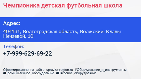Чемпионика, детская футбольная школа по адресу 404131, Волгоградская область, Волжский, Клавы Нечаевой, 10 в дальнейшем Организация, размещена в следующих категориях: