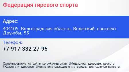 Федерация гиревого спорта по адресу 404105, Волгоградская область, Волжский, проспект Дружбы, 55 в дальнейшем Организация, размещена в следующих категориях: