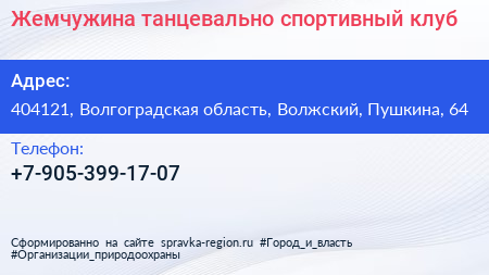 Жемчужина, танцевально-спортивный клуб по адресу 404121, Волгоградская область, Волжский, Пушкина, 64 в дальнейшем Организация, размещена в следующих категориях: