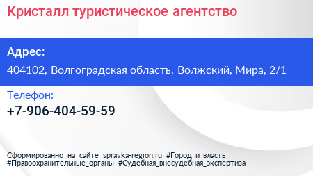 Кристалл, туристическое агентство по адресу 404102, Волгоградская область, Волжский, Мира, 2/1 в дальнейшем Организация, размещена в следующих категориях: