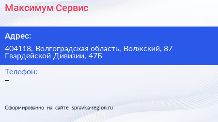 Максимум Сервис по адресу 404118, Волгоградская область, Волжский, 87 Гвардейской Дивизии, 47Б в дальнейшем Организация, размещена в следующих категориях: