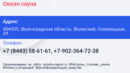 Океан, сауна по адресу 404105, Волгоградская область, Волжский, Оломоуцкая, 29 в дальнейшем Организация, размещена в следующих категориях: