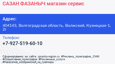 САЗАН ФАЗАНЫЧ, магазин-сервис по адресу 404143, Волгоградская область, Волжский, Кузнецкая-1, 2г в дальнейшем Организация, размещена в следующих категориях: