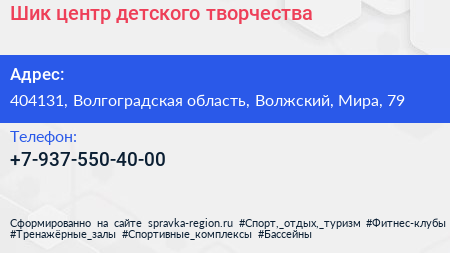 Шик, центр детского творчества по адресу 404131, Волгоградская область, Волжский, Мира, 79 в дальнейшем Организация, размещена в следующих категориях: