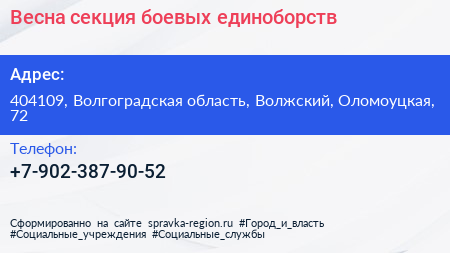Весна, секция боевых единоборств по адресу 404109, Волгоградская область, Волжский, Оломоуцкая, 72 в дальнейшем Организация, размещена в следующих категориях: