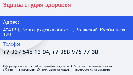 Здрава, студия здоровья по адресу 404133, Волгоградская область, Волжский, Карбышева, 120 в дальнейшем Организация, размещена в следующих категориях: