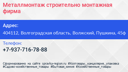 Металлмонтаж, строительно-монтажная фирма по адресу 404112, Волгоградская область, Волжский, Пушкина, 45ф в дальнейшем Организация, размещена в следующих категориях:
