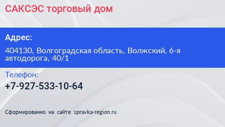 САКСЭС, торговый дом по адресу 404130, Волгоградская область, Волжский, 6-я автодорога, 40/1 в дальнейшем Организация, размещена в следующих категориях:
