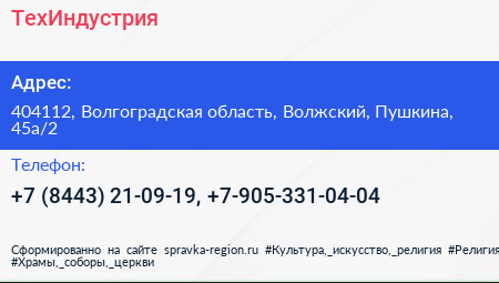 ТехИндустрия по адресу 404112, Волгоградская область, Волжский, Пушкина, 45а/2 в дальнейшем Организация, размещена в следующих категориях: